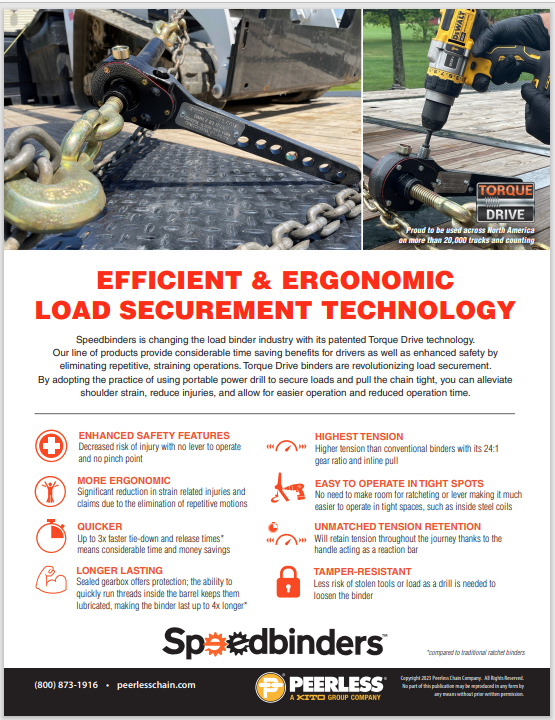 Speedbinders is changing the load binder industry with its patented Torque Drive technology. Our line of products provide considerable time saving benefits for drivers as well as enhanced safety by eliminating repetitive, straining operations. Torque Drive binders are revolutionizing load securement. By adopting the practice of using portable power drill to secure loads and pull the chain tight, you can alleviate shoulder strain, reduce injuries, and allow for easier operation and reduced operation time.